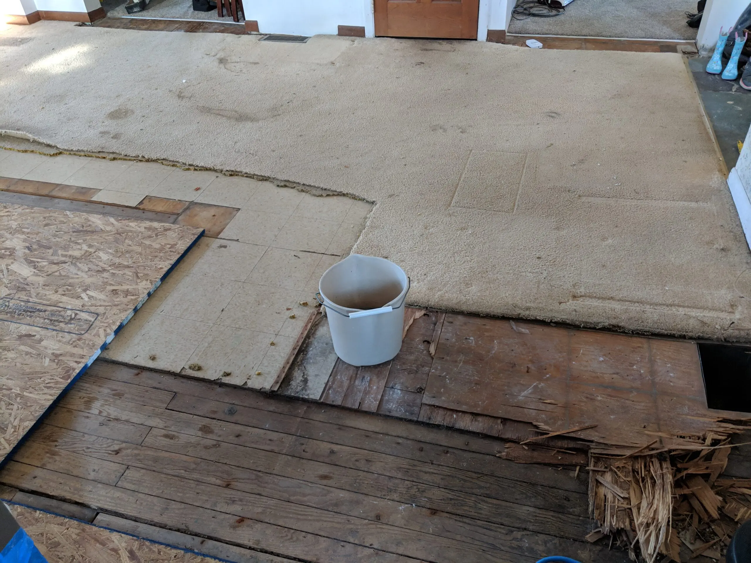 So there was carpet, pad, stick down tile, paneling that the tile was stuck to, hardwoods (that were too damaged to refinish) and subfloor.