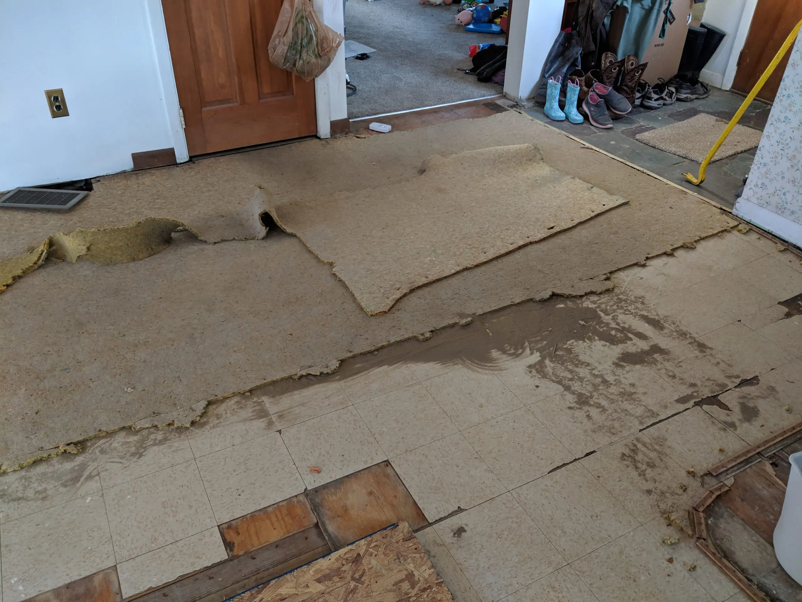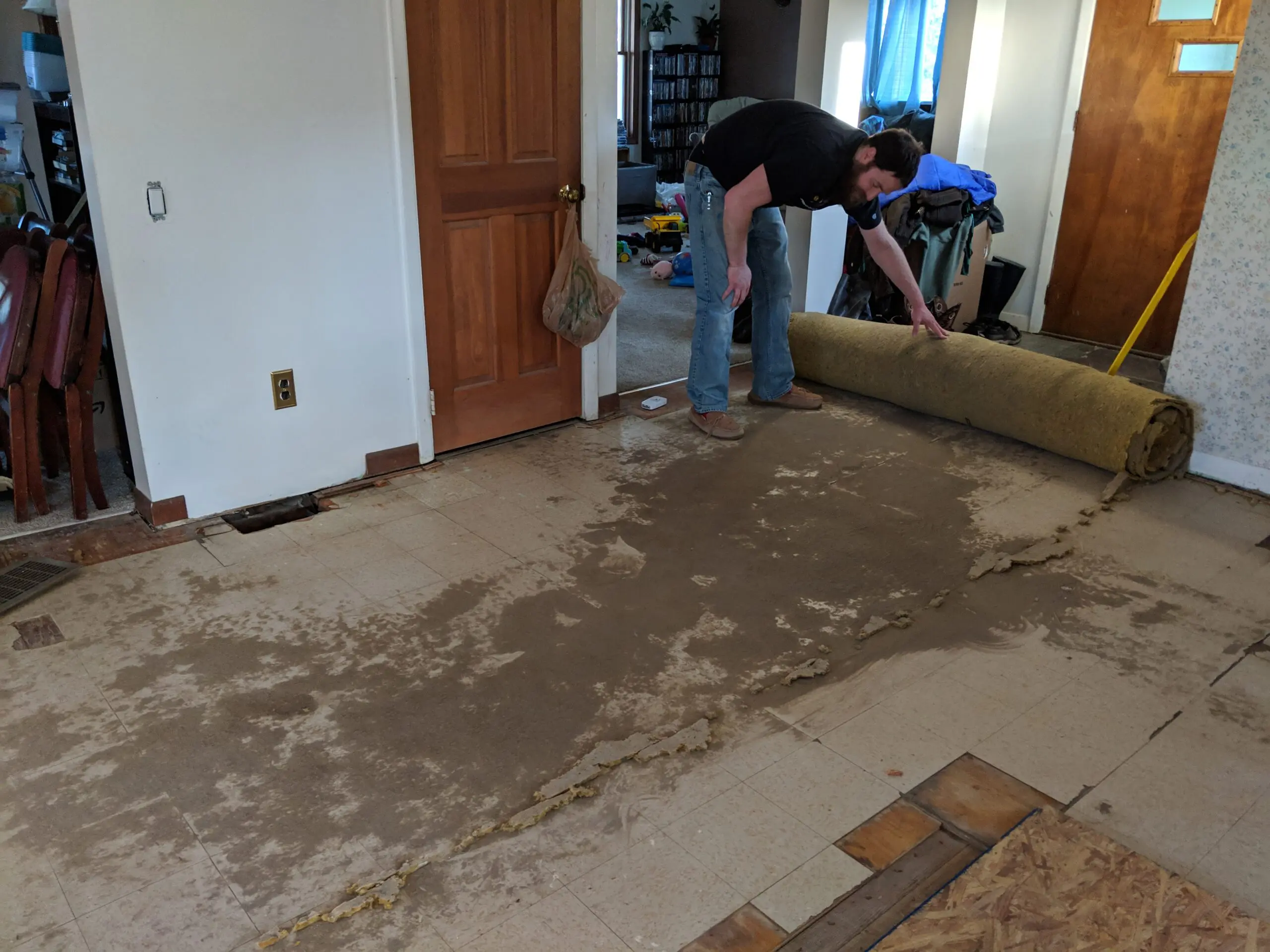 There were FIVE layers of flooring. All of it was garbage, so it got ripped up and new subfloor was put down.