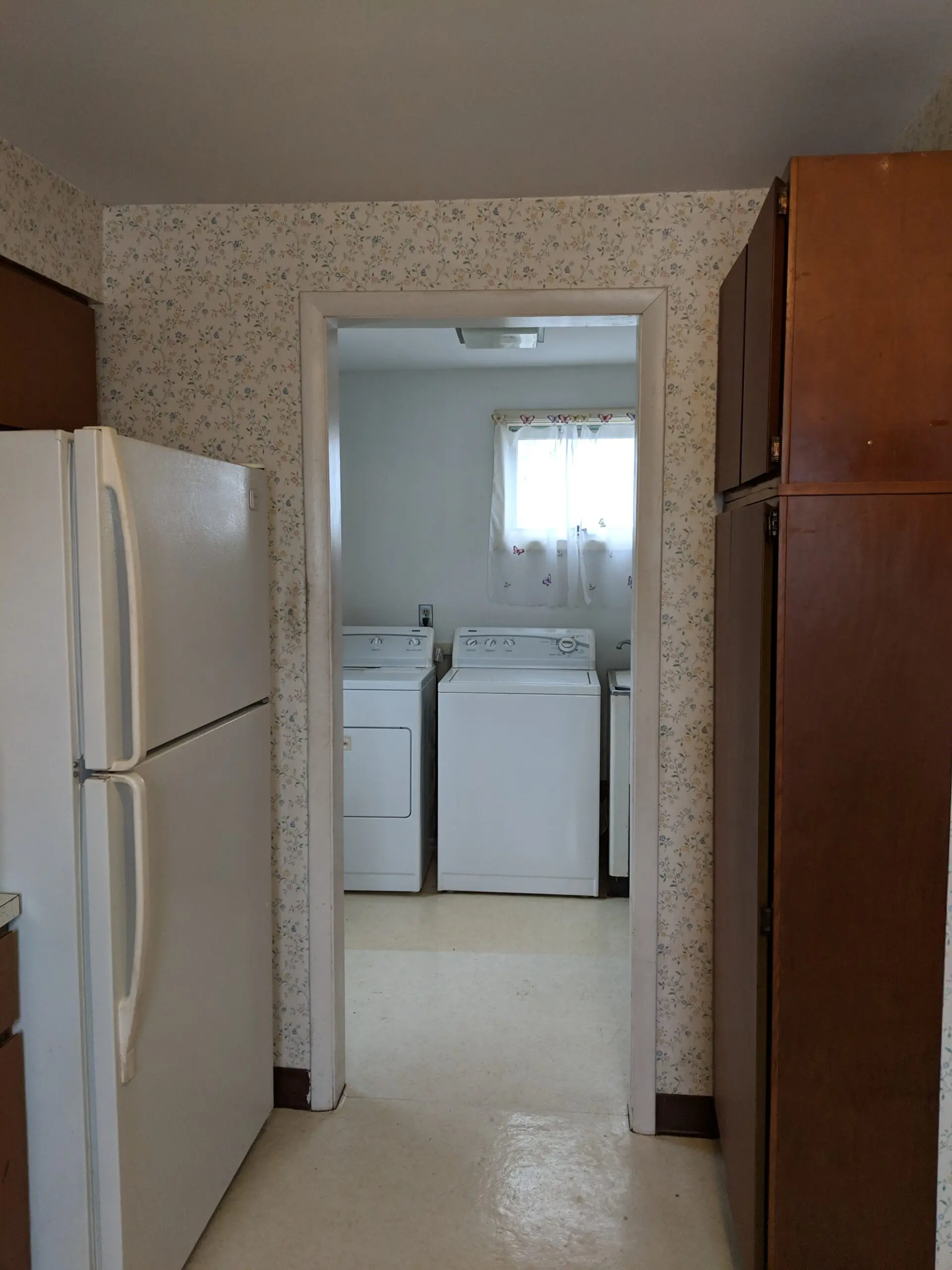 Flooring was linoleum over stick down tile and the area had terrible flow. The back entrance opened to a laundry, that went into a weird L-shaped bathroom and then turned into the kitchen. Basically there were hallways everywhere in that space.