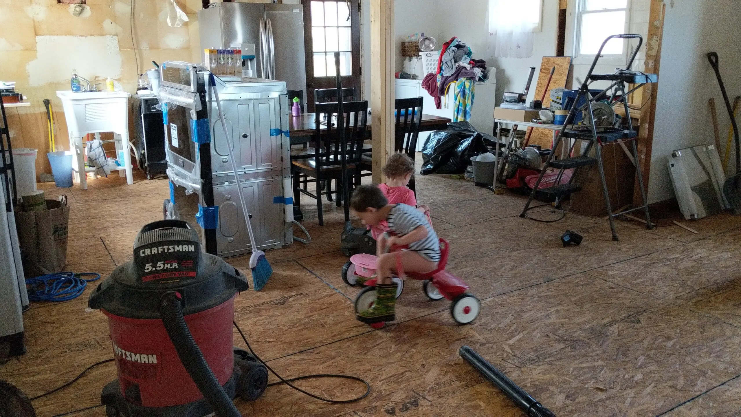When you’re living in a major renovation with little ones, you do what is necessary to keep them happy and occupied safely. Trikes in the kitchen/dining on the new subfloor can bring on hours of fun.
