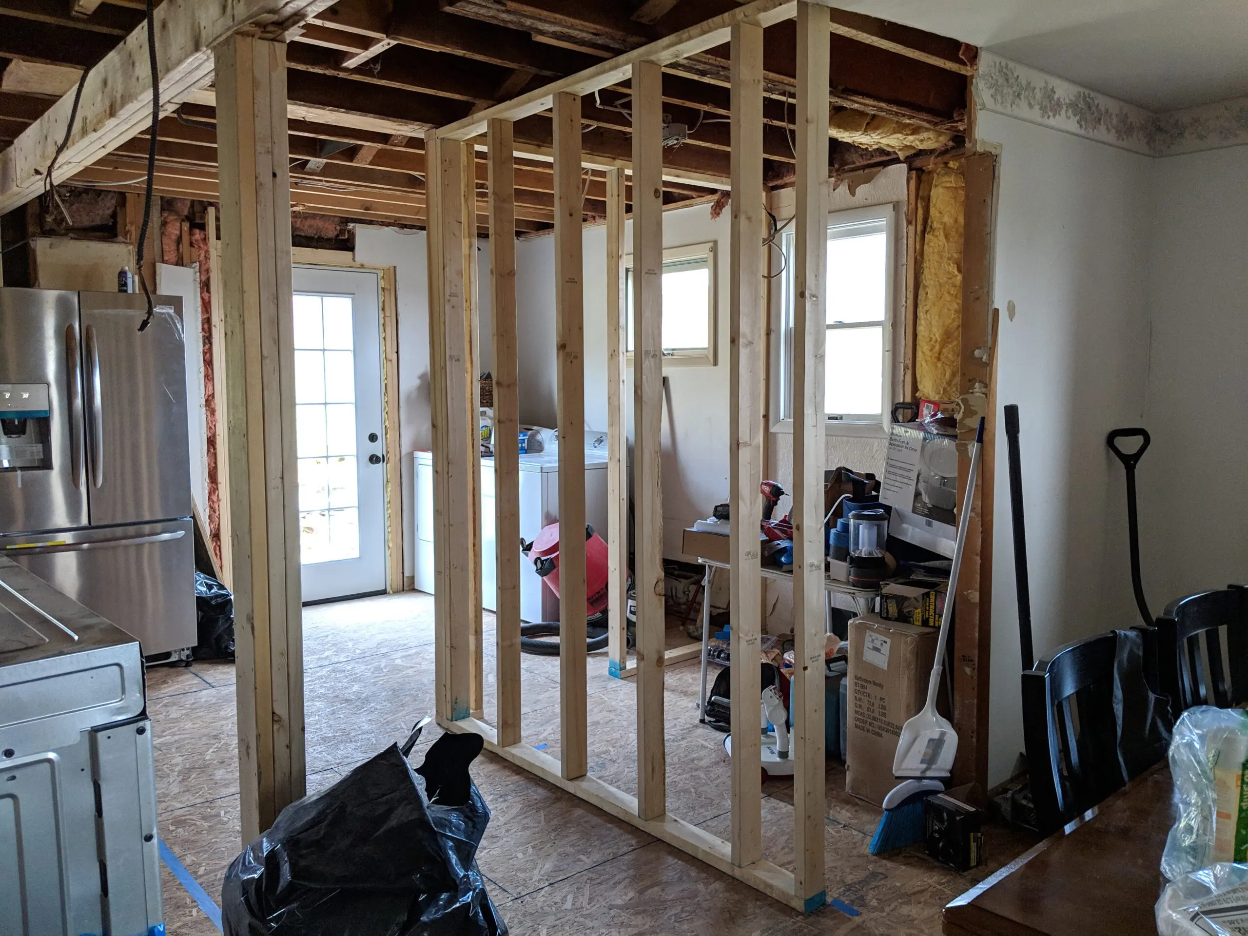 Next, new bathroom walls went up. (My double ovens stayed wrapped and attached to the dolly so they could be easily moved and protected).