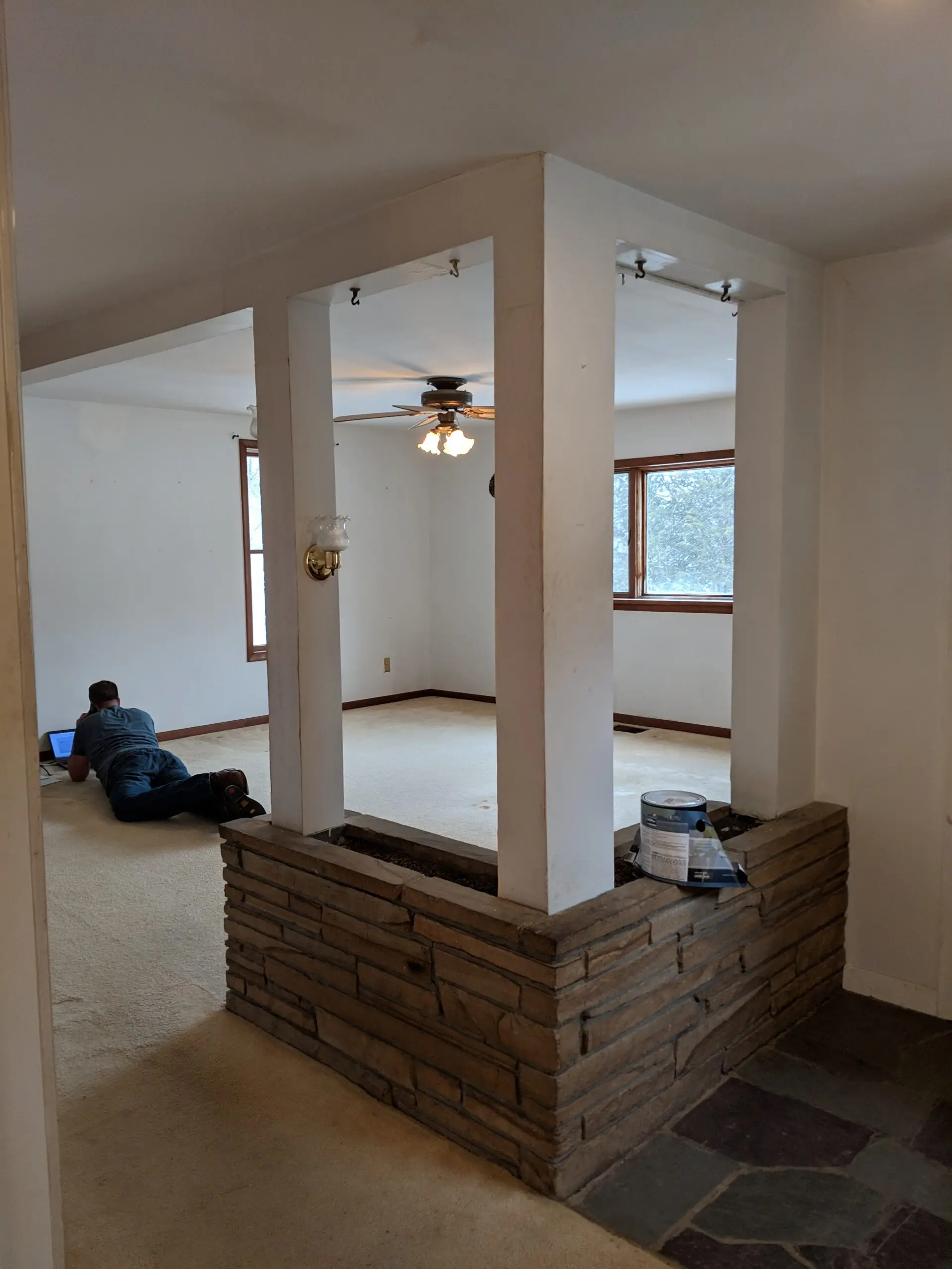 First thing to go: the previous owners, somewhere along the line, had permanent stone planters installed in the living room. They were full of gravel and dirt and nails and dead leaves and other miscellaneous junk.