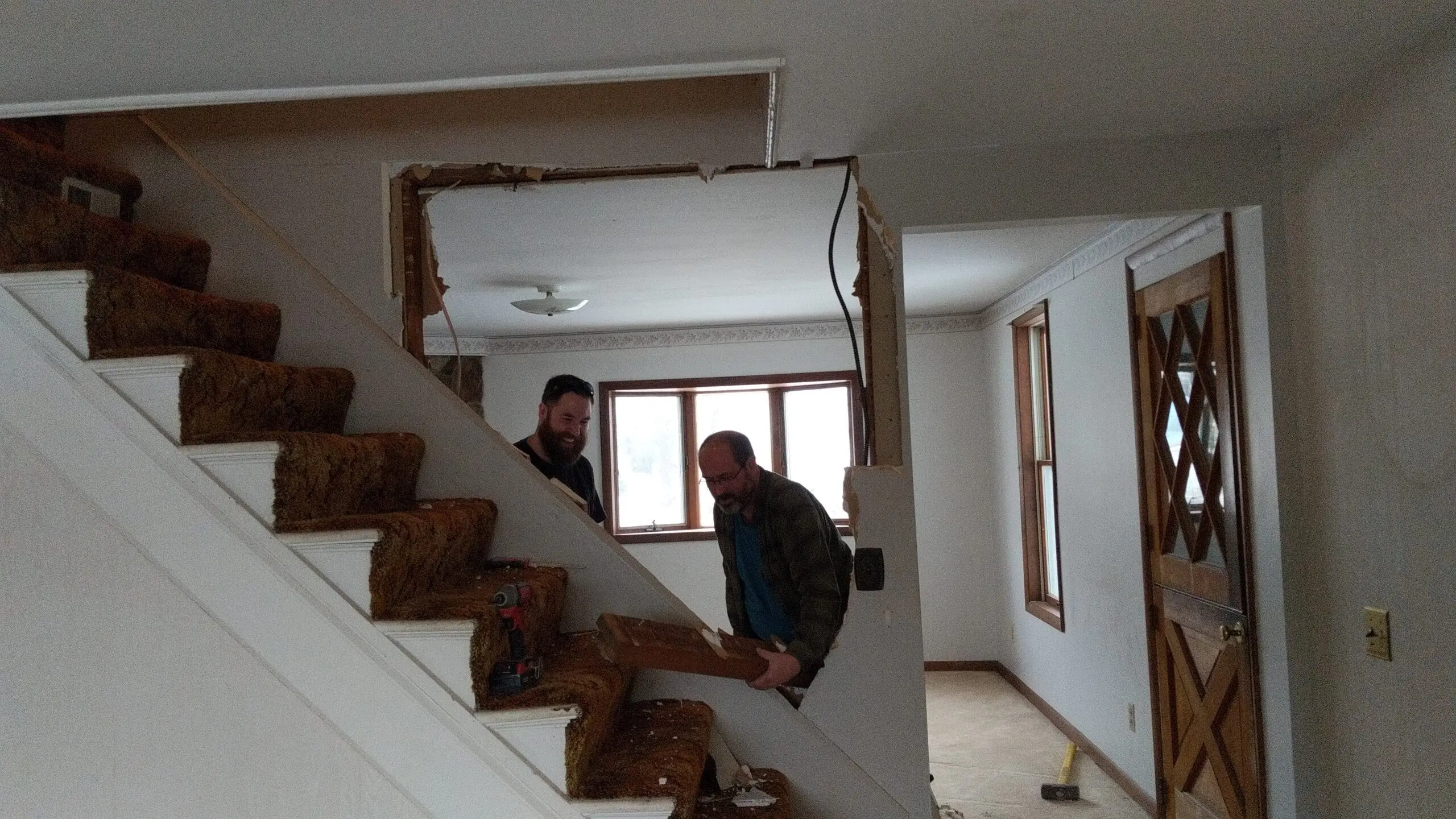 Ryan and Dad opened up the wall separating the stairs and the living room from the family room.