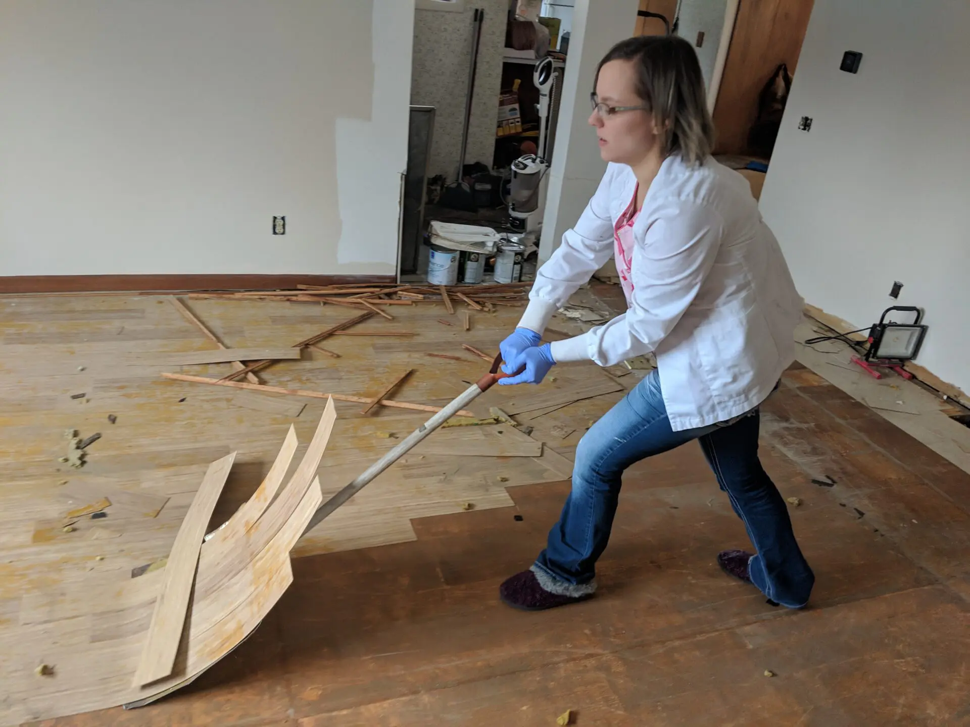 We tag teamed major grunt work, like tearing up the layers of stick down tile and plank flooring that was underneath the ratty carpet in the living and family rooms with a single flat metal shovel that was left at the house. It came in SUPER handy.